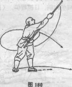 左胸后退一步,两脚碾地,体左转180度,两腿成左弓步, 同时两手握棍由后向前抡打。然后随身向前戳棍,棍消向前,目 视棍梢。(图177) -
