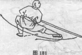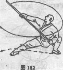 左脚向前跳一步,右脚格左脚前,两脚用地,体左转90度, 左腿全蹲,右腿伸直"两腿成右仆步,同时,两手握棍由前上方 向后轮打,然后随身势向右侧下方劈棍,目视棍梢。(图181)