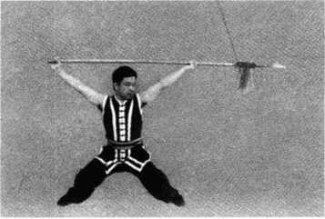 (I )马步举枪;双手持枪上举过头,枪尖向前(图3-6 )