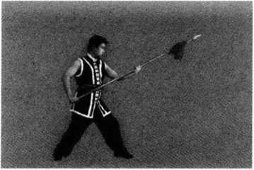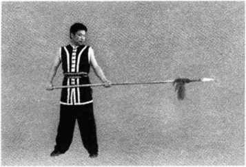 (1 )马步;双手持枪上举过头,枪尖向前(图3-8 )