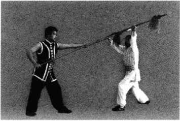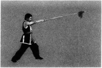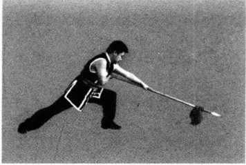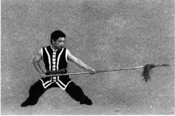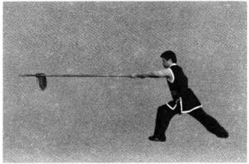 (2)站左脚向前上半步,右脚随向前紧跟上半步,两脚直腿站立;双手持枪向 下向前抖扎枪(图3-7 )。