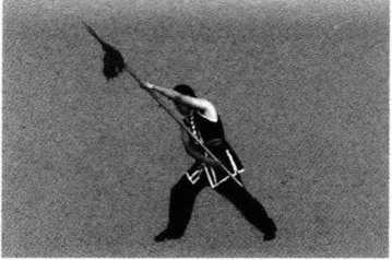 “长河落日”一技是典型的扫蹄枪演练者左脚在前成左大弓步;右手握把在后, 左手在前持枪;从斜后上向斜左下扫击马蹄(图3-13.图3-14)