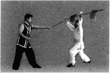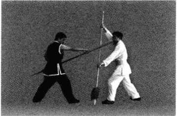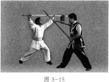 左脚在前,成左犁头桩;右手握把放在腹部,右『持把在前,枪尖从F向上挑 击对方枪杆(图3-18 )