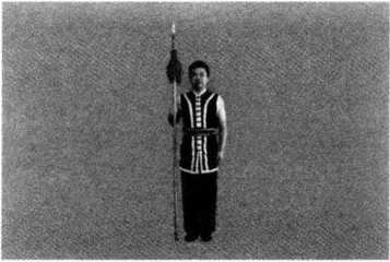 面朝南,两腿直,两脚尖外八,并足跟;左臂垂直,左掌体旁贴,右手屈肘紧 握枪杆中部,虎口朝上,枪杆直立于身体右侧;两眼向前平视,全身自然放松(图 4-55 )