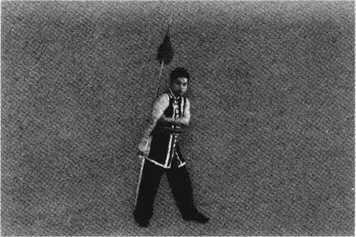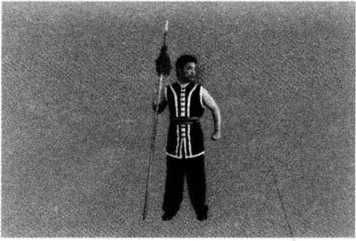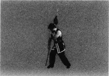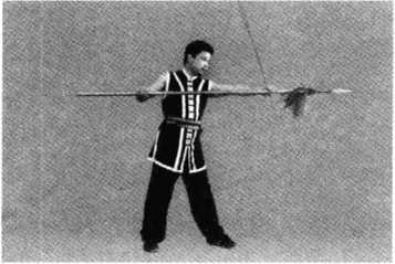 (2) 上动不停,右手握枪杆卜-端三分之一处,由下向左向上向后划弧,将枪杆 平端于胸前;上动同时,左手握枪杆三分之一处,枪尖向后,向下,向前上划弧, 左手前,右手后,将枪杆平端于胸前(图4-61 )o