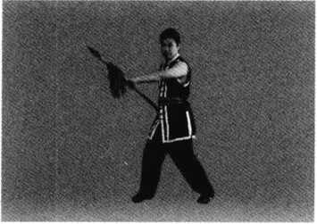 (1) 提右脚,用右脚外侧向右敲打枪杆端部,迫使枪杆向左侧斜倒;上动不停, 上体略向右转,左腿略向右微屈,左拳变掌,虎口朝上,紧握枪杆前三分之一处; 上动同时,右手握杆松开向下滑行至枪端三分之一处紧握枪杆;上动不停,左手握 枪杆前端至三分之一处向前下压枪杆;右手握枪杆下三分之一处向后上提枪杆(图 4-57) o
