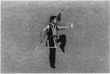 (3) 上动不停,上体左转,左腿屈膝上提,右腿直立;左手松开枪杆,变掌从 胸前向左推掌,拇指内扣,四指直立,向左摆头;两眼注视前方.右手握枪斜背于 身后(图4-59 ) 0