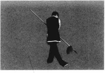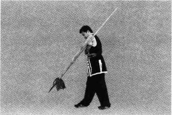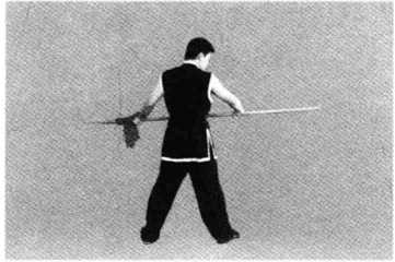 (5) 上动不停,上体右转,左脚向左前方平挪半步,平行站立,两腿之间距离 略宽于肩;上动同时,双手握枪杆,枪尖从下向右向上,向左后划弧,两手叉臂随 枪旋转,至胸前自然打开,枪杵平抱于胸前(图4-64 )