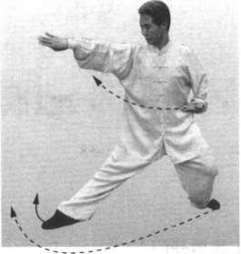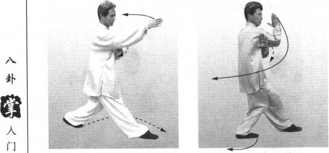 两臂相错,右臂内旋,右掌沿左臂下方向左前方穿出,虎 口向上,拇指微扣,指尖领路,掌与肩同高;左臂边外旋边贴肋 后撤,左掌置于右肘窝处,虎口向上,拇指微扣。同时,身体左 转,右脚向左前进步走行步桩。目视右掌方向(图4-3-55 )。