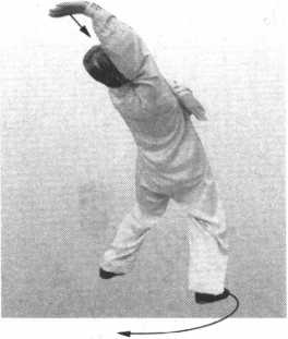 右臂弧形下落向右撩起,掌心向后,小指一侧向上,拇指