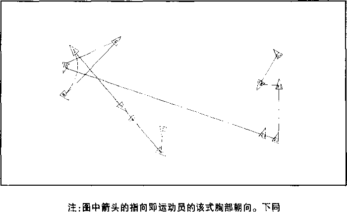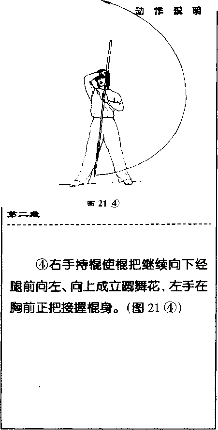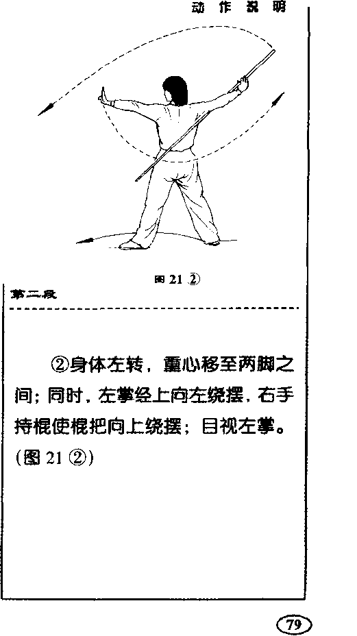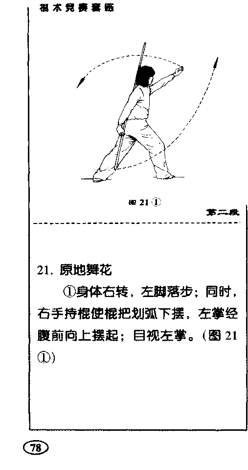 ,右手使棍把向右 侧平摆,棍身^于背后,目视棍把。 (图19⑤)福木竞II春路第一收17 .提膝背棍右腿直立,左腿屈膝提起;同 时,右手持棍稍向下压使棍梢上移 成背棍,左掌变拳,左臂屈肘;目视 左侧O (图20)第一段动作路线示意图图21⑥ 第二成