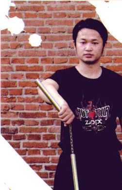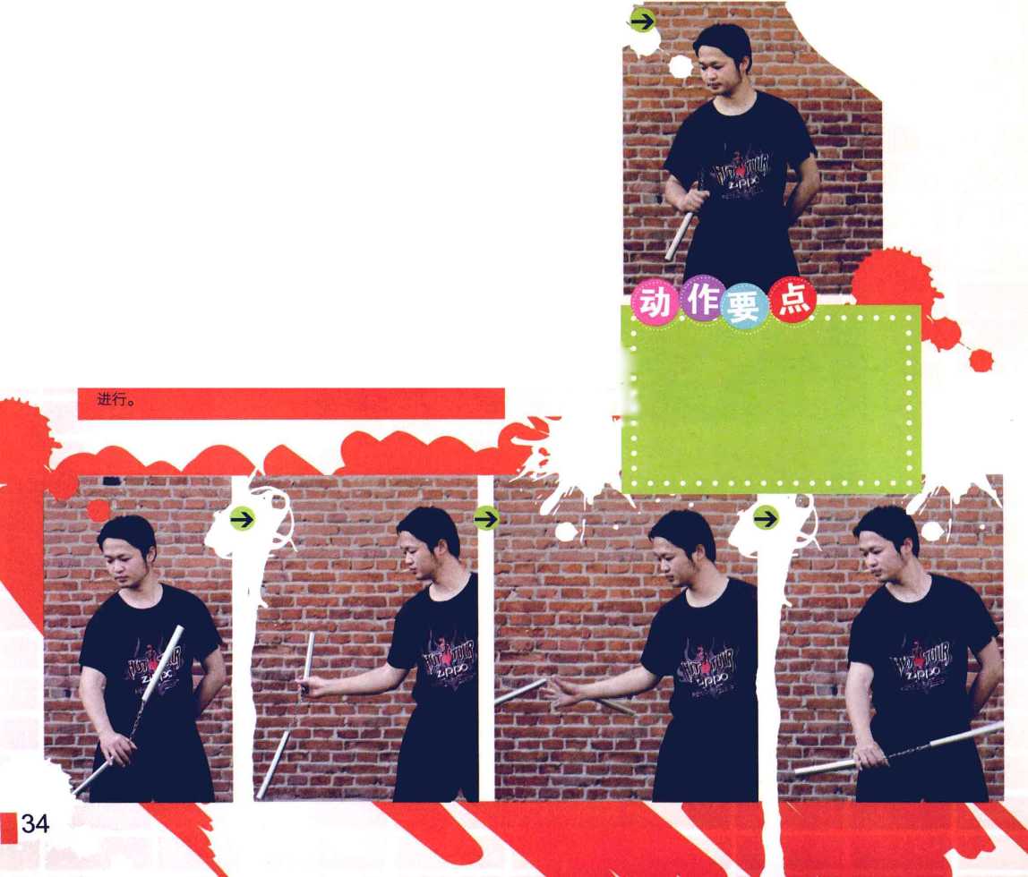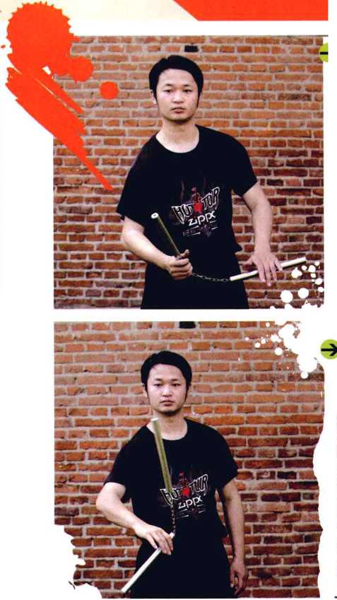 (2)左手顺时针辅助拍击B棍,右手伸开棍链,棍链绕 右手掌半圈。