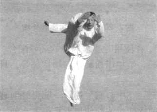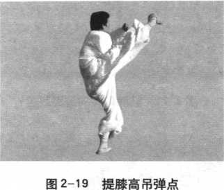 部或软肋,着力点放于足 趾。点腿的形式很多,如 在套路或技击使用中,以 点脚踢对方下颏或前胸, 仰点、穿点、提膝吊点等。 又如蹿点,也叫腾空二蹦 脚、腾空飞脚、跃步十字 弹等,点腿如穿梭。目随 腿行(图2-24)。