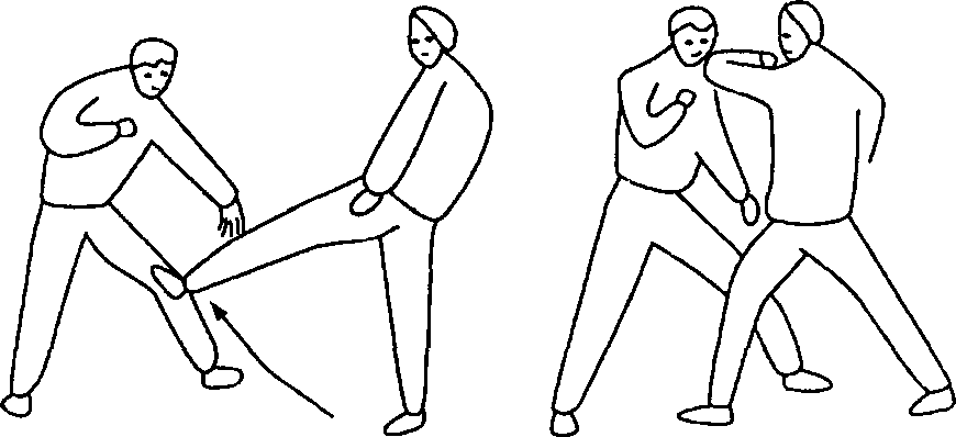 敌我对峙。我滑步向前,同时用左脚向前踢击敌前腿,敌急速