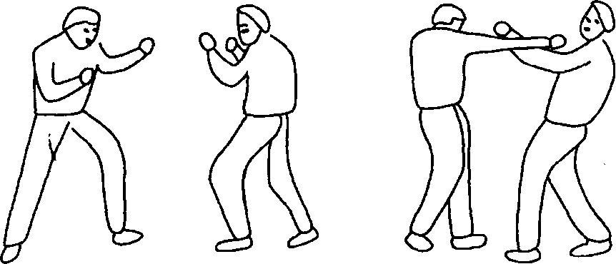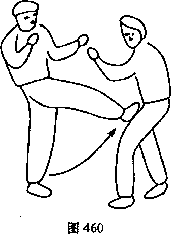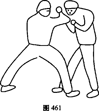 敌我双方成自卫格斗势(图457);我跃步上前,用左直拳、右 摆拳连续击打敌方之面眼部与左太阳穴(图458、图459),紧接着 再用右脚前踢敌之裆部(图460),然后,右脚落地,左转身,屈右肘 向左猛扫敌之头部左侧部位(图461 )o