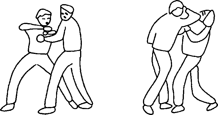 动作简析:这是一组以拳、肘、膝为主要攻击武器的组合连击 动作。我方在用拳击打敌方面部时要快速、凶狠。当敌方在受到 左肘的攻击时必然会收腹低头,我方此时正好用肘挑击敌方下颌 或扫击其头部左侧,可一击必中。当敌头部遭受打击时会形成仰 颌挺腹的姿态,这就给我方抬膝攻击敌之腹裆部造成了一个极好 的机会,在膝击敌腹之后,再辅以肘击,更加大了击打威力与攻杀 效果。
