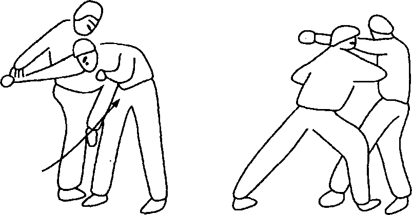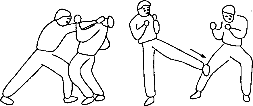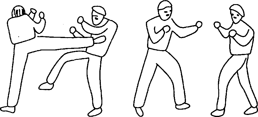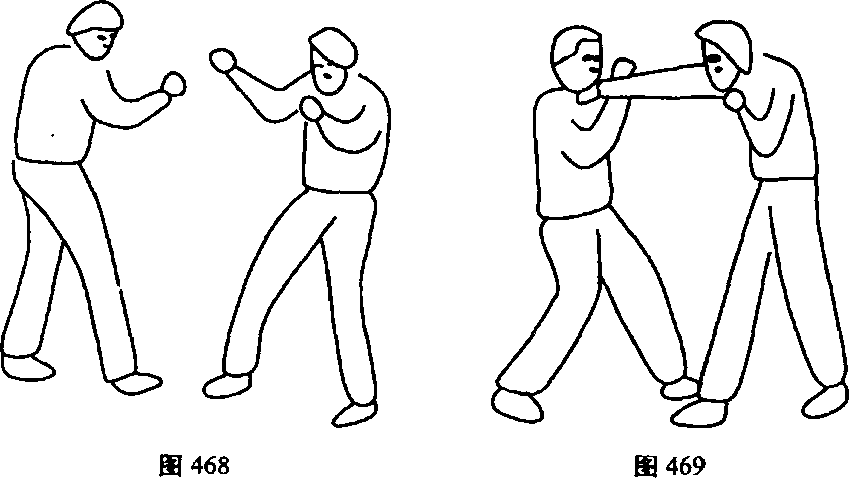 敌我双方成自卫格斗势(图468);敌向我滑步逼近,并用右拳 向我面部击来,我速向左前上步闪避,同时用右臂格挡敌右拳(图 469),并顺势抓提住敌右手腕向己方右后拉带,同时速抬右膝猛