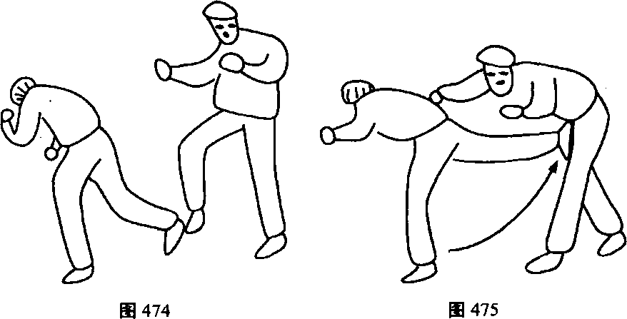 超强腿击实战法超强腿击实战法图470 图471图470 图471(图473)o如敌抬腿躲过踹腿,我方左脚立即上抬,左侧背对敌 方,左脚落地后垫步跃近敌方,右脚由下向上用脚跟撩勾敌裆(图 474、图475),最后右脚落地,左转身,右腿弹起侧扫踢敌肋部,将 敌踢倒重伤在地(图476) o