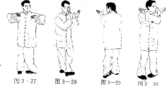 右脚划弧扣于左脚前,同时两手交叉向里合,右手在内, 左手在外,两臂略水平,两手交叉于胸前成十字手,上体中正, 两膝合抱,气沉丹田,目视正前方(图3—29正面、图3—30反 面)。