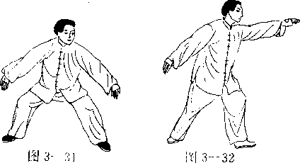 身体左转,左脚向左后(艮位)横跨步,右脚随之跟步成马 步。同时两手向下翻转成下十字手,并随横跨步向两体侧外上 直臂撑掌,掌指朝下,掌心朝外,两腿弯曲,身体中正,松腰坐 胯以助两掌上撑之势,意在两掌,目视正前方(图3—31)。