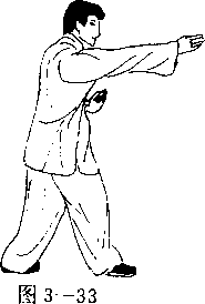 7.蹚步穿掌承上式,右脚向前(震)蹚出一 大步,左脚跟步。同时,右手变侧立 掌,拇指第一小节内扣,并以虎口蹭 擦左肱部下,松腰探膀向前直臂穿 刺,意在指尖;左手回拉至右肋下变 侧立掌,意如拉弓放箭,目视右掌 (图 3—33)。