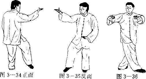 掌着地,脚尖正对圈线。在撤步的同时,身体左转,两手同时动 作,右穿掌由外向内片至左胸变仰掌,意在掌指外沿;左侧立 掌由右腋下经胸前向左腋下内旋变俯掌,掌心向下,掌指向 前,眼睛目视右掌(图3—34正面、图3—35反面)。