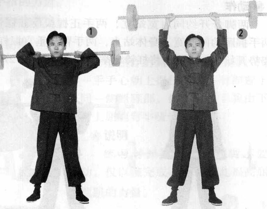 窄于肩,向上举起后落至颈后,然后两手同时向上弯 举杠铃至手臂伸直(图1、2)。