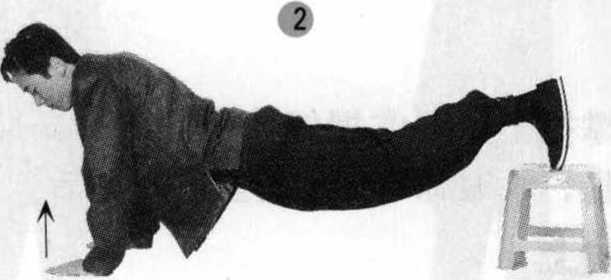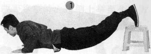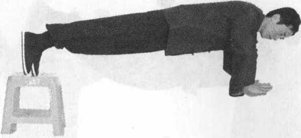 两手先撑在地上,两腿向后伸直并拢,以两脚尖 蹬在凳子或阶梯上,两手用力撑推地,在使两手掌撑