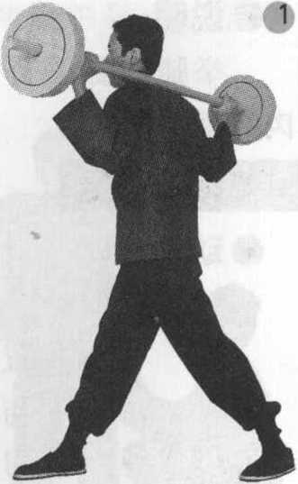 两脚分开约同肩宽站立, 两手握持杠铃扛至颈后,扶住 杠铃,然后做左右侧转体动作 (图Do或者做向身体左右侧 倾斜动作。