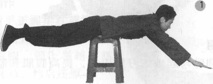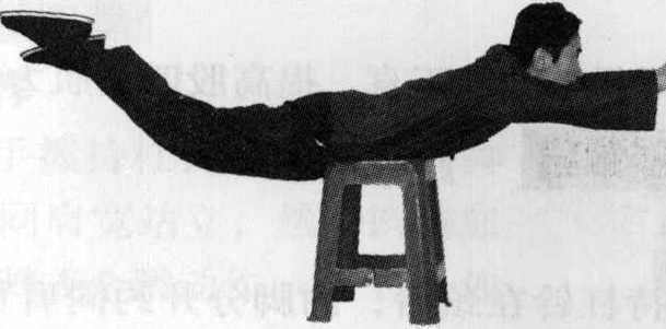 俯卧在凳子上,两臂和两腿分别并拢伸直,略含 胸低头,然后两腿和上体及两臂同时向上翘起,使身 体成反弓形(图1、2)o