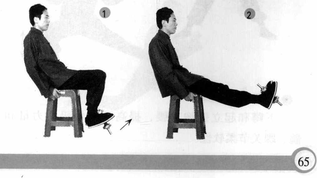 可坐在稍高凳子或阶梯上,用一脚钩住或在脚尖 系住一哑铃,然后做腿屈伸练习(图1、2)。
