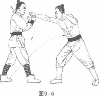 [实战举例】1.敌右脚进步,右拳 击我下颌。我左脚退步, 起双手托抱住敌右拳。(图9-5 )2.不让敌反应,左脚鞭踢敌腰部,将其击倒。(图9-6)