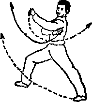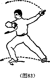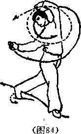 S3)。②上动不停,右脚尖里扣,右腿褙fi起,左腿从:/T腿 后面向右侧偷步,左腿稍屈膝,两腿构成交叉步;左剑指同 吋臂内旋,使手心朝下,从左向前、向右弧形平摆,上身随 之向右屈腰倾倒,左臂趁势屈肘;右握杯拳在左脚向右偷步 的同时,从右胸前向下、向前、向右直臂弧形摆动;眼看右 握杯拳(图84)。③上动不停,左剑指不变,上身从左向 后、向上翻转;右握杯拳随身向后、向上转动I当上身转至 北方时,左剑指从上向左、向下直臂弧形绕环下垂,右握杯 拳从右转至上举部位;上身继向左转,面向西方,左剑指在 上身左转面向西方时,从下向后继续绕环;右握杯拳则从上向 前继续绕环;右脚当上身转向西方时,向前(西方)上步,右腿