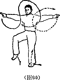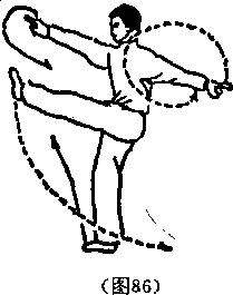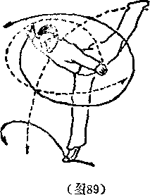 拳(图 87)(图 88)前、向左绕环摆动;右剑指则随身转动举于右侧I右腿当上 身左转面向东南时向后举起,形成燕式平衡状态(图87) p ⑥上动不停,上身继续向左拧转,左脚蹬地跳起,身体悬空 (图88)。⑦在空中旋转一周,右脚落地,形成左腿后举的 燕式平衡状态(图89。⑧上动不停,右脚掌碾地为轴继续使 上身左转;当上身左转至面向北方时左脚在身后落地,上身 直起,右脚离地,以左脚掌为轴碾地,继使上身左转面 向南方,完成一周的旋转(图90)。⑨上动不停,上身继续 左转朝向东南,右脚在右侧落地I右剑指变举松握,从右侧 向右肩前屈肘,使小臂平摆,至右肩前之后,继续直臂向