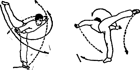 作,都必须连贯起来进行。②两腿交叉向后、向上翻身时, 注意左剑指屈肘在头顶上方不变,仅随身转动,在上身转至 北方时,再开始转动绕环3③左腿平踢时,腿须伸直踢起, 不是屈膝向前弹踢。④旋子转身必须迅速,右脚离地要快; 在空中上身必须平俯,旋转要达成一周。⑤旋子动作前后的 燕式平衡,均是旋子的过程,不要求停顿,它必须和前后的动 作贯串起来。