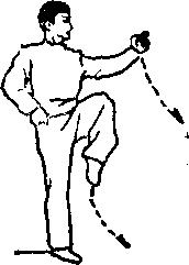 上、向东方绕环,至东方之后继续向下、向后屈肘浇环汝至 右腰侧,拳心靠身;左剑指同时 变为握杯拳,当右拳绕环至东方 时,屈肘向下、向里绕环,当右掌 收至右腰倜时,继续向上、向前 (东方)绕环,拳眼朝上;左腿在 两拳完成绕环动作的同时,屈膝 在身前提起,脚面绷平,脚尖朝 下;眼看左握杯拳(图91)。