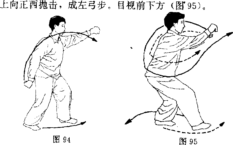 换式:撤右步,双手在胸前竖向划弧,向后下掳?再上 右步向上反把上抄,连环捌绳(图96),