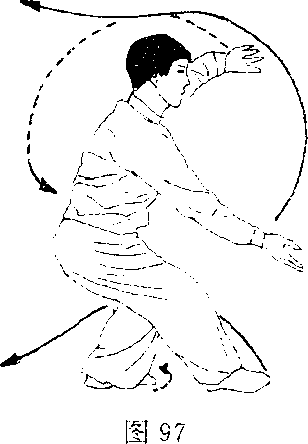 换式:撤左步,后坐身.双手吸在两肋,尽量坐身续力。 目视前方(图99几