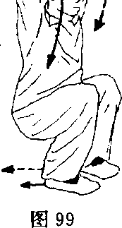 换式:摆左步,上右步,前横后直,双手抓树枝打跖姿 式,同时坐身。目视前方(图98).