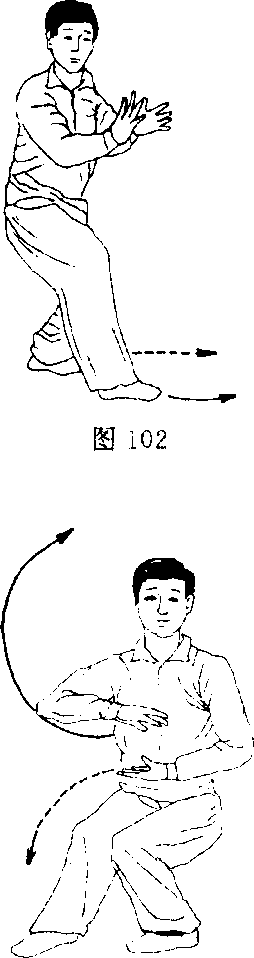 图101图101图100图100再扣右步,顺左步转身,同时双手变平推掌,向前成右 旋行功转走。目视前方(图101)。
