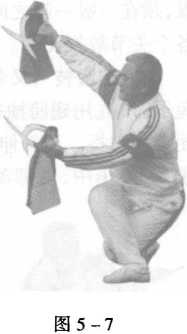上动不停。对手后撤躲闪,并持枪 刺我右肋。我立即落左腿,屈膝下坐,大 腿根部外掰,前脚掌实踏地;右腿向左 跨,搭在左大腿上,屈膝,外摆脚尖,脚 跟实踏地,蹬住劲,成“枯树盘根”之式; 同时,右拧身,右臂由屈而直,五指紧握 钺柄,翻腕上挂枪,将枪头别住,意欲架 托,擒拿;左手钺微往回搂,略缓功而备 冲力(图5-7)。
