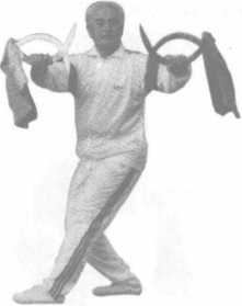 上动不停。我乘势顺时针向上翻转右手腕,使对方陷于被 动。此刻,彼必极力往回拽枪,我便顺其拽枪之力,起身,向前大 步迈左腿;同时,往里拧裹右手钺,左手钺自右臂下方平刃前刺;
