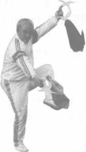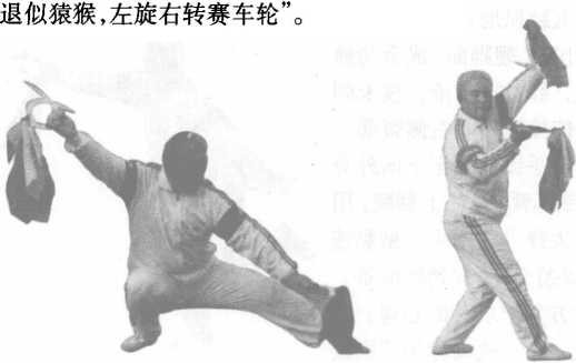 上动不停。此刻,我为防备对方 刺我左肋,便左转腰90。,提左胯高抬 腿,绷脚面,五趾下探,提臀,吊裆,意 守丹田;同时,将左手钺由下至上向 外分,带对方之枪。在意识的统率下,动作连贯,准确自如,呼吸 顺遂,进退开合,虚实变换,自然连贯,使对方失去重心,陷于被 动。我将背运通,右臂沉肩蓄劲,翻腕端钺下刺彼之小腹。右腿 独立支撑全身的重量,五趾抓地(图5-11)。不能出现仰、俯、 歪、斜,这样既不利于转换、变化,而且易造成被动,使对手乘隙 而入。“不利则逆,逆则滞,滞则止,止则 败”。