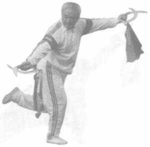 上动不停。我紧接着右转腰90。,右脚也随着外摆90。,边摆 脚,边屈膝下坐。重心要稳,不能左右摇摆。左脚随着转腰而扣 步90。,伸腿前探,微绷脚面,脚掌虚踏地,两腿成前虚后实之 式。两大腿表面要平,这样能使背劲、裆劲、腿劲充分发挥,又可 变化及时。左手钺同时由上而下翻腕朝右下方刺彼裆;右手钺 上挑,双臂外展而意含合劲。整体动作须同时完成,且要快速稳 健,使劲力完整,充实。身械应协调。由于这套动作是在刹那间 完成的,且又是侧面技击,反应要快,动作要灵活,因此须平日加 紧练习。否则站都站不稳,甭说与人过招了(图5-15)。