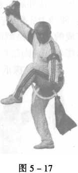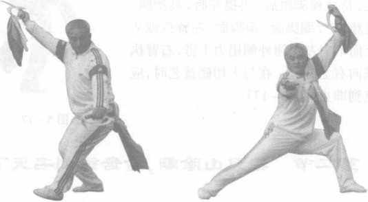 对方欲避过此招,并刺我左腿膝盖 外侧上三寸处的阳关穴(此穴一旦被击 中,即刻全身瘫痪),我则顺其势将重心 移向右腿,躲开这一刺。若对方不肯罢 休,连续击之,我便将重心完全移至右 腿,待立稳脚跟后,再提左胯,高抬腿, 屈膝45。,绷脚腕,垂脚面;左臂执钺从 上而下向左大腿外侧用力下劈,右臂执 钺向右上方撩。在与人切磋技艺时,应 点到即止(图5-17)。