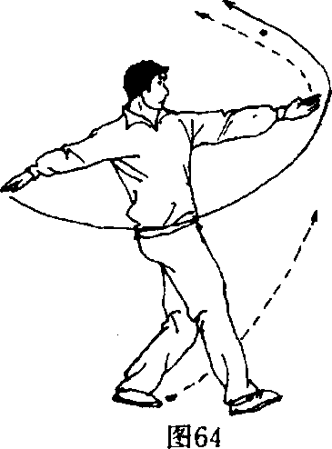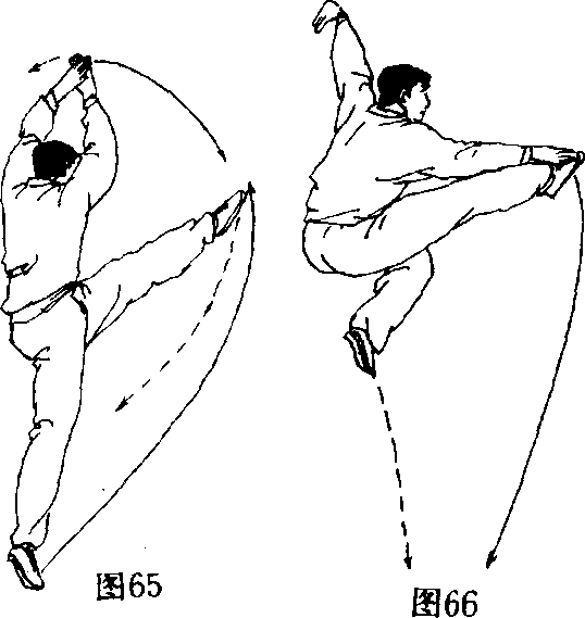 [动作]左脚在体前站立,右脚向前上步,左腿向前高提, 随即右腿起跳,右脚尖绷平向前上方踢出,在空中右掌拍击右 脚面,左手勾手摆至身体左侧斜上方,目视前方(图64、65、 66)。也可以垫步接上步再接腾空飞脚。
