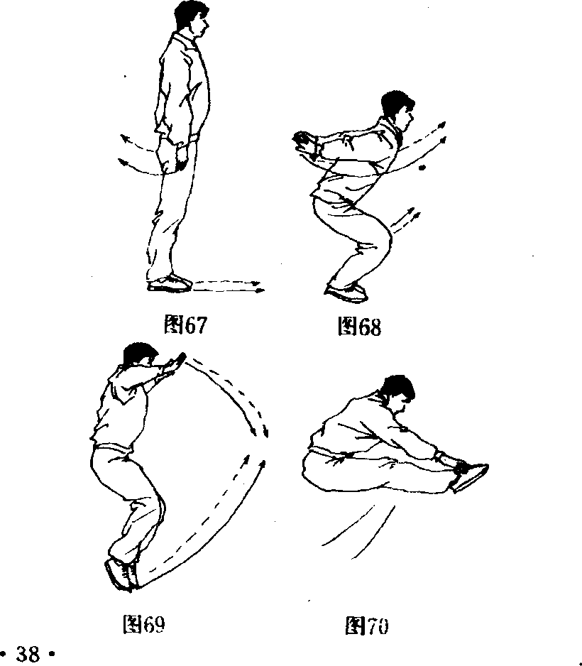[动作]两脚并步站立,左脚向前上步,右脚紧跟,重心下 降,两臂后摆,双腿同时起跳,身体腾空,双脚面编平同时向前 上直腿踢出,两手在空中同时拍击两脚面(图67、68、69、70), 然后双脚同时落地。