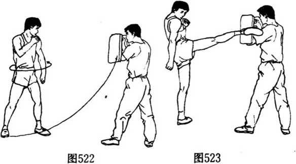 助手两脚前后开立,双手屈肘竖持脚靶置于头前两侧,略 比头宽,拳手上步用边腿踢靶(图522.523).