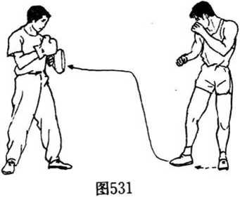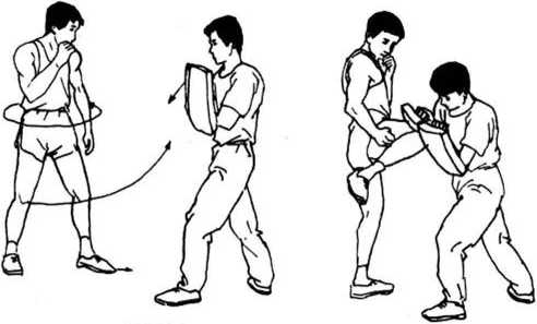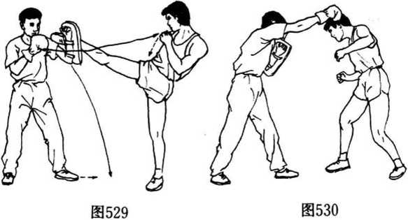 助手左手屈肘持靶 竖于左侧,右手戴上手 套,拳手用右边腿踢靶, 助手乘拳手收腿之机用 右手击打,拳手躲闪或 格挡防守(图528、529、 530)。