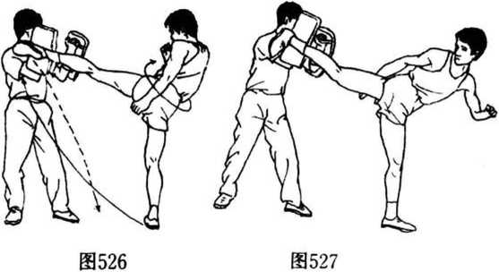 助手两脚前后开立,双手屈肘持靶竖于头前两侧,拳手用 左边脚踢助手右侧脚靶(图526),然后落左步,用右边腿踢助 手左侧脚靶,或者落步向右转体,右倒抡腿踢击助手右侧脚靶 (图 527)。
